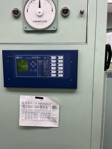 The auto synchronizing system allows a generator to automatically start up and tie into the electric grid without causing damage to the generator. A large part of its purpose is to ensure the generator is operating at the correct voltage and speed before connecting to the grid. Schweitzer Engineering Laboratories (SEL) was contracted to provide the synchronizing unit along with settings to meet the plant's needs, and the upgrade was performed mostly in-house. The new system utilizes an SEL 451, which gathers information from the generator then tells the exciter and governor to adjust speed and voltage; then, when everything is just right, it tells the breaker to close, connecting the generator to the grid.
