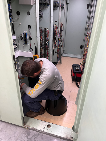 The newly installed SEL 451 system. Reclamation photo Electrician Matt Miller working on the wiring. Reclamation photo Electronic Technician Dylan Snyder working on the wiring. Reclamation photo