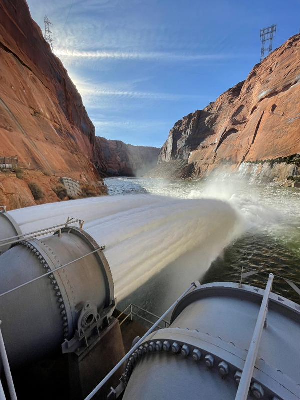 The river outlet works at Glen Canyon Dam recently underwent testing to assess their reliability to deliver water from Lake Powell downstream. The outlets were designed to help regulate the flow rate or draw down the reservoir. The outlets are also the only way to send water downstream if Lake Powell were to drop below the minimum power pool elevation of 3,490 feet. Reclamation photo