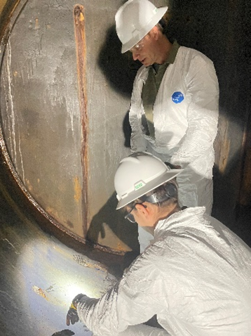 Engineers from Reclamation's Technical Service Center inspect the interior of an outlet pipe at Glen Canyon Dam. The testing and inspection didn't uncover any substantial problems and is part of the effort to accelerate maintenance of the outlets. Reclamation photo