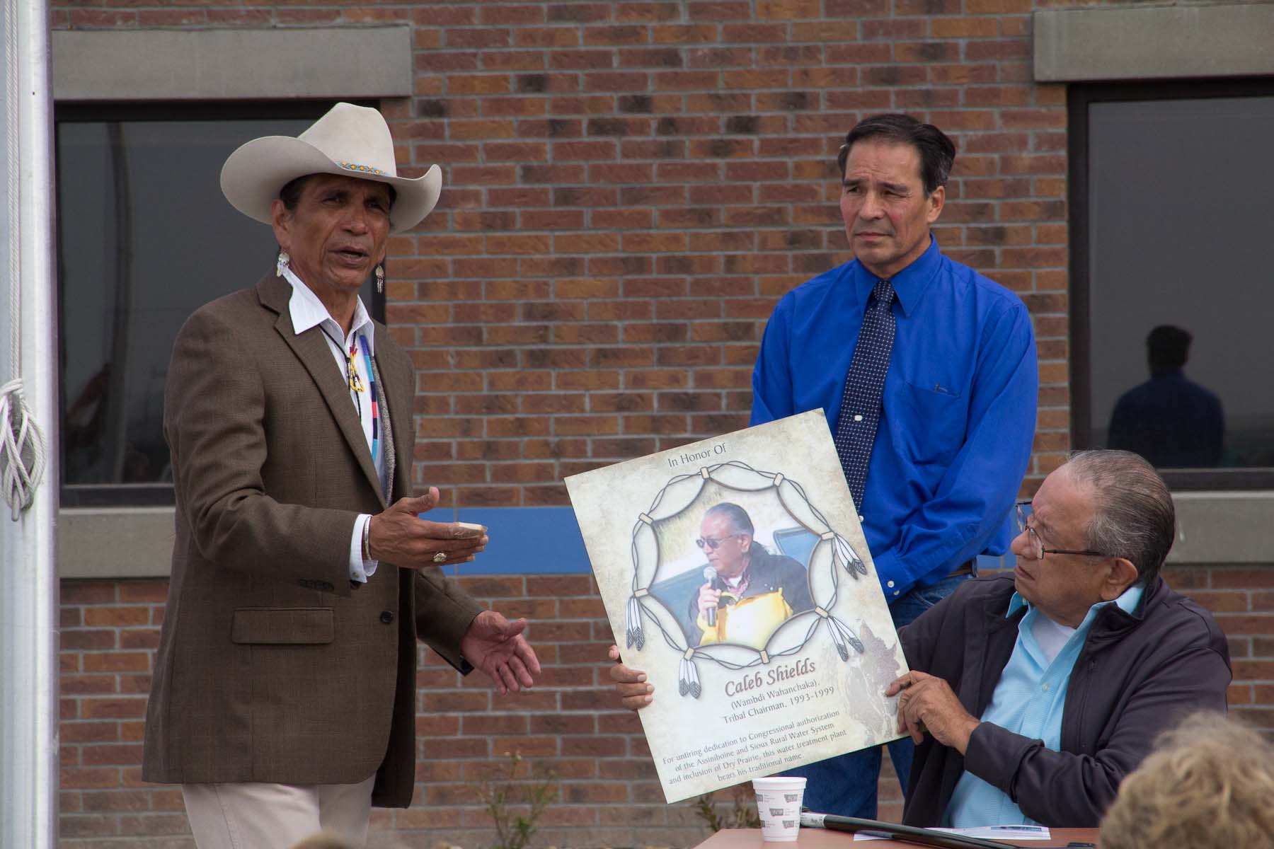 Mr. Tommy Christian, Ft. Peck Tribal Councilman (left), Floyd G. Azure, Tribal Chairman Fort Peck Assiniboine & Sioux Tribes (center right) and Dr. Caleb Shields, former Tribal Chairman (seated at right) during the naming ceremony for the treatment plant.