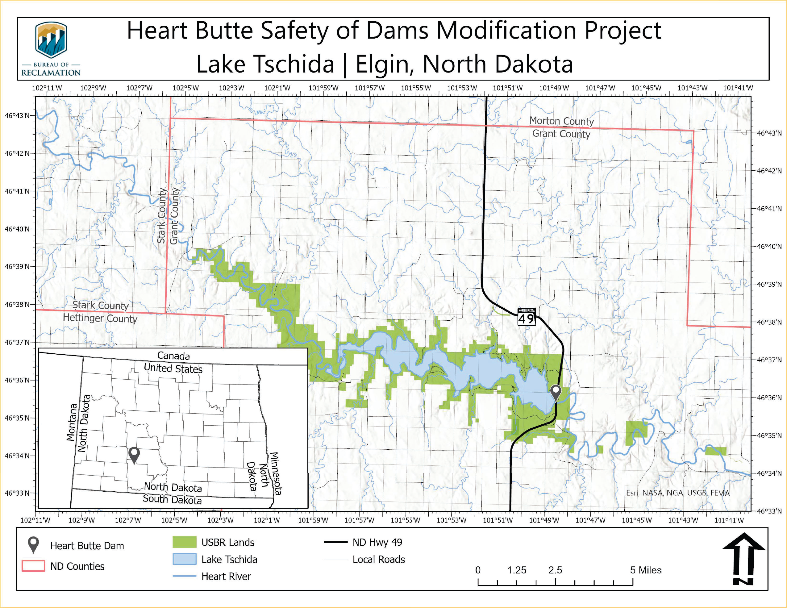 Heart Butte Dam on the Heart River in south central North Dakota is a homogeneous earthfill structure completed in 1949. Heart Butte Reservoir (Lake Tschida) currently provides water for irrigation, flood control, recreation and fish and wildlife benefits. The Heart Butte Unit irrigation lies in scattered tracts along the Heart River to the Missouri River. There are approximately 13,100 acres of irrigable land.
