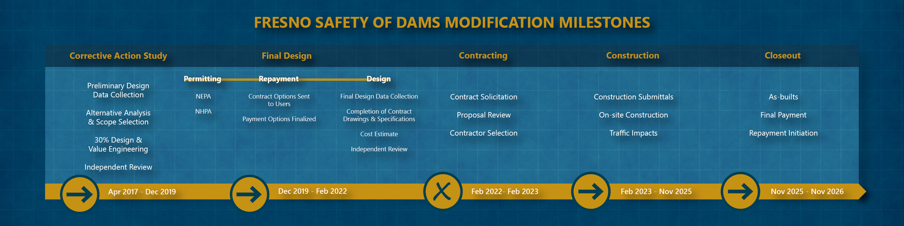 Reclamation initiated a Safety of Dams Corrective Action Study in April 2017 in response to identification by the Reclamation Dam Safety Program of dam failure risks above Reclamation’s Public Protection Guidelines. Historical settlement of the Fresno Dam foundation and lack of current state of the practice dam filter and seepage collection system are driving these concerns. In addition, to ensure risks are as low as reasonably practicable, an incidental effort to add spillway joint state-of-the-art defensive measures was added to the dam safety project. Interim measures including increased visual inspections and stockpiling of filter materials at the dam have been implemented. There are currently no operational restrictions at Fresno Dam.