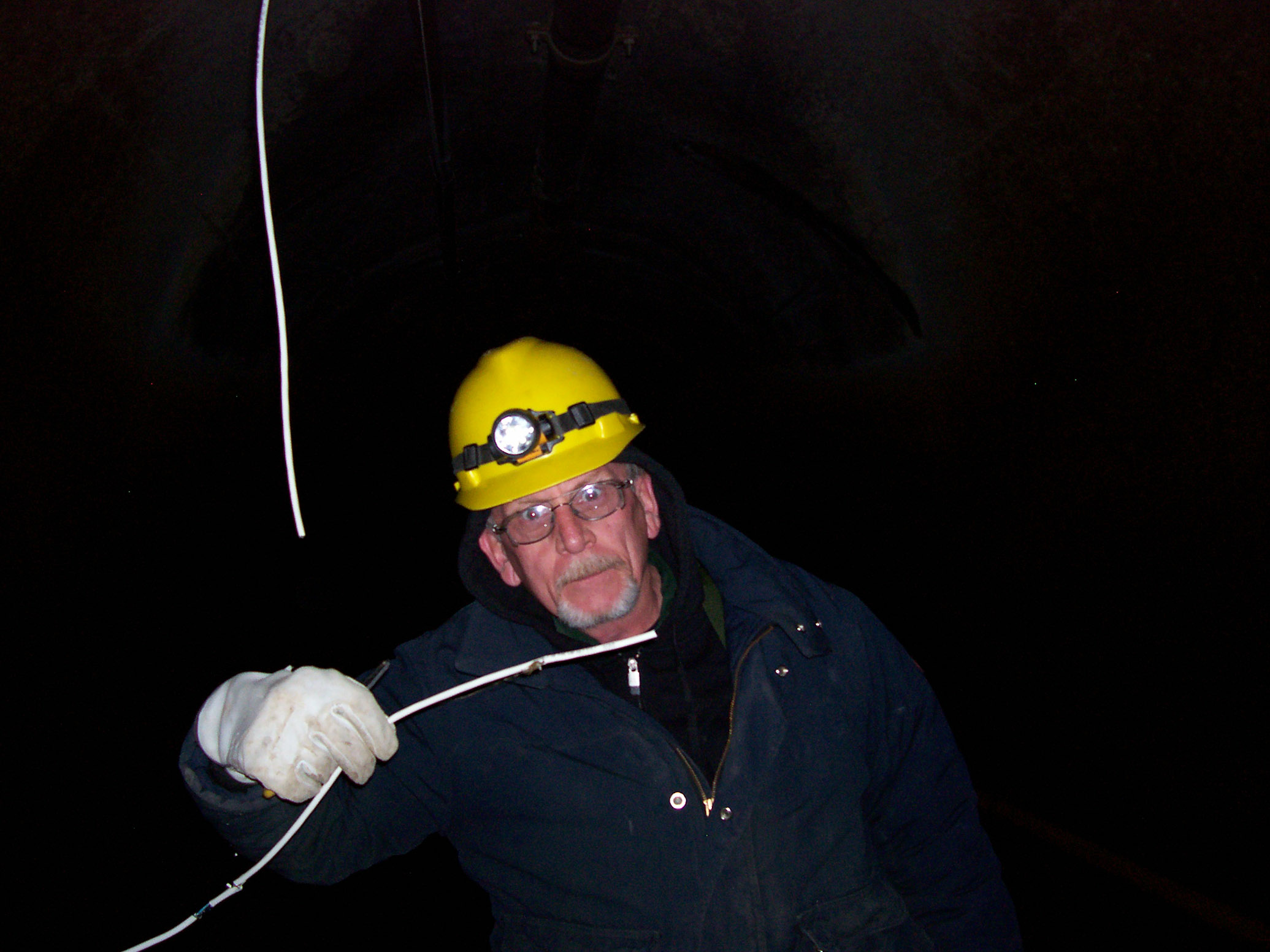 Green Mountain's Electrician Mark Stanfill deep in the Adams Tunnel under the Continental Divide working to fix a thermocouple device. Photo by Charles Young.