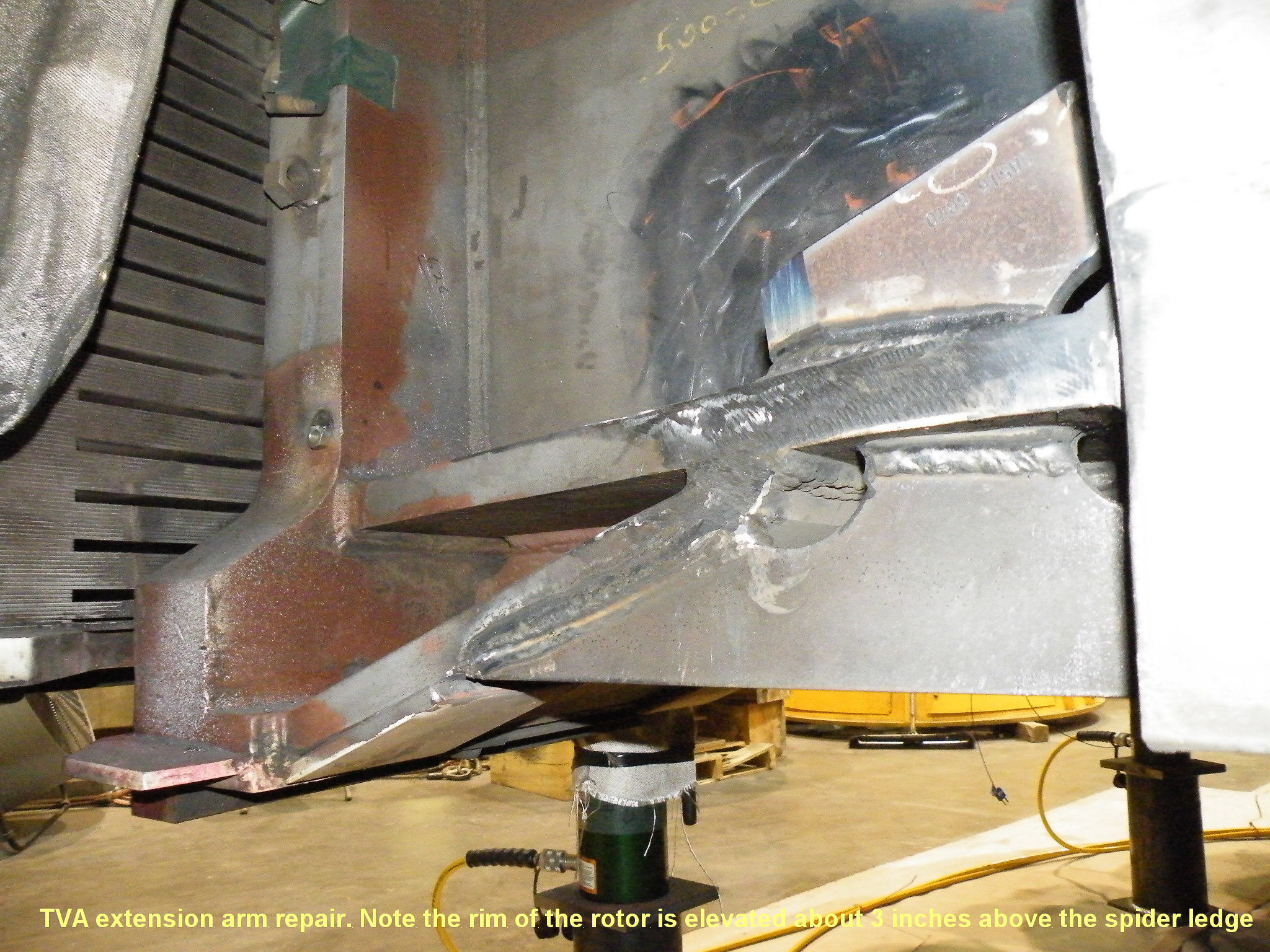 TVA extension arm repair at the Mount Elbert Powerplant. Note the rim of the rotor is elevated about 3 inches above the spider ledge. Photo by Brad Littlepage.