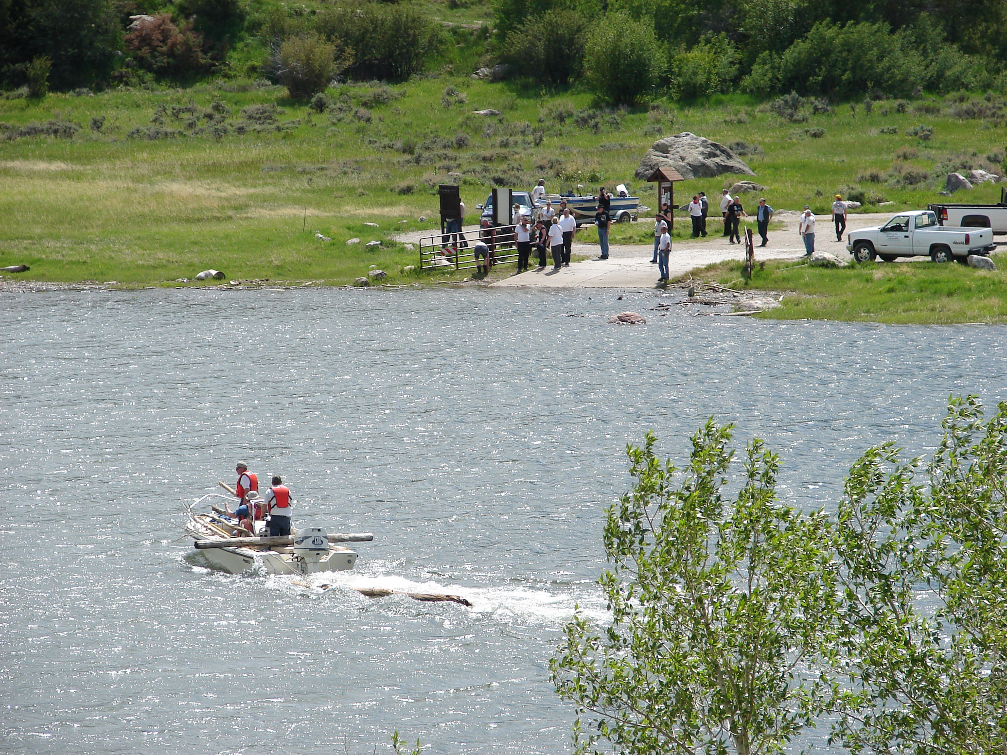 Green Mountain Reservoir Supervisor (on shore) Jeff Cross, and employees Mark Stanfill, Matt Scruggs, and Chuck Young putting the beetle kill logs on shore to be used for firewood by campers. Photo by Stan Young (Chuck's father).