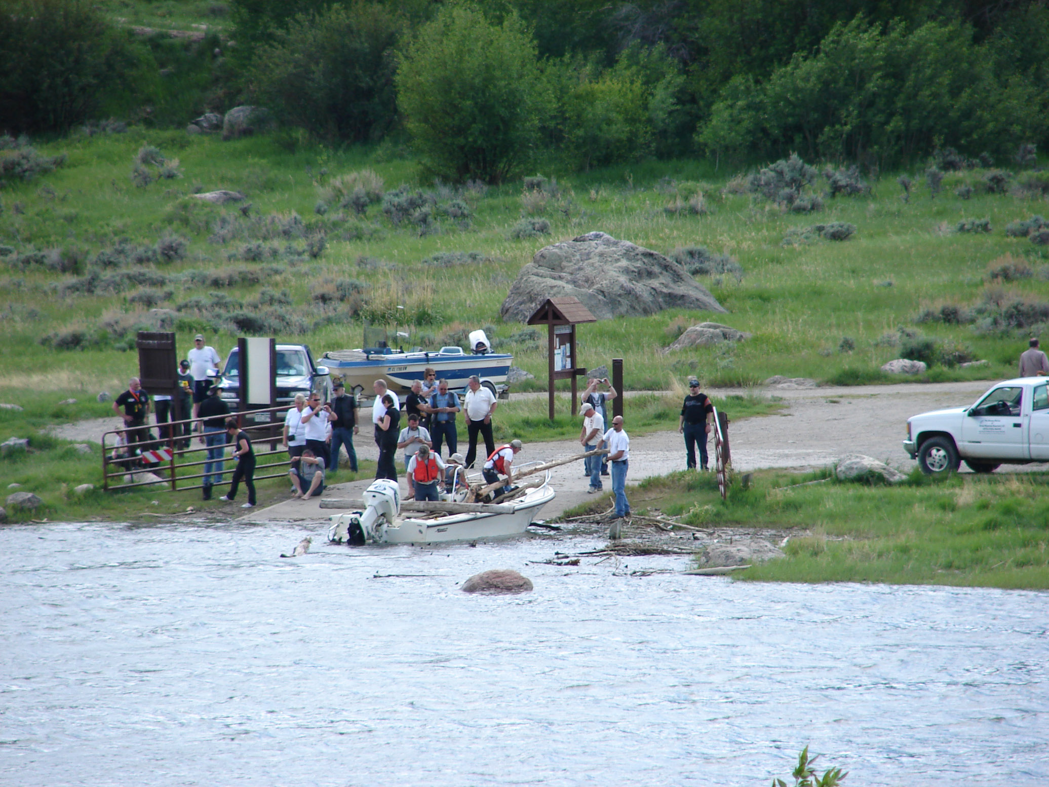 Green Mountain Reservoir Supervisor (on shore) Jeff Cross, and employees Mark Stanfill, Matt Scruggs, and Chuck Young putting the beetle kill logs on shore to be used for firewood by campers. Photo by Stan Young ( Chuck's father).