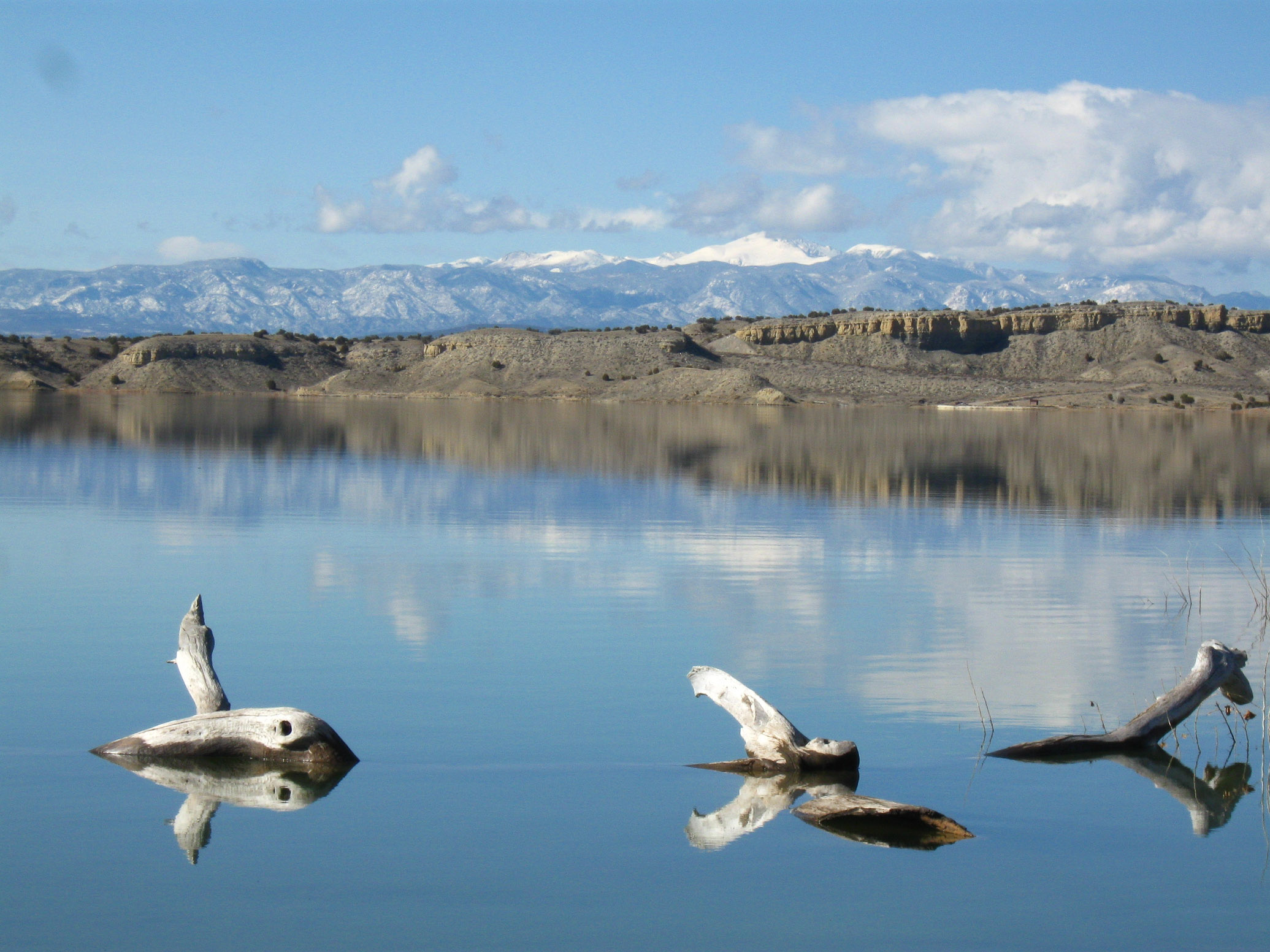 Driftwood floating in a lake with Pikes Peak in the background. Photo by Stanley Core.