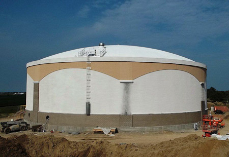 Painting and brick trim being added to one of the TEA ground storage reservoirs in August 2011.