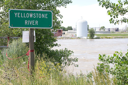 The Yellowstone River at flood stage at the highway bridge showing the City of Laurel water treatment plant (note the sandbagged dike protecting the plant). Image taken July 7, 2011. This is just upstream of the oil pipeline and spill.