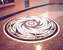 To create the terrazzo, the workers imbedded marble chips in cement, separating them with brass or aluminum divider strips to make a tiled pattern. After the mosaic hardened, they used large finishing machines to polish the surfaces. The result was a lustrous terrazzo.