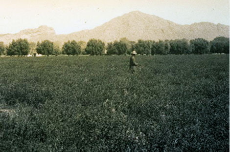 A 1909 view of an alfalfa field with olive hedge fence. (Reclamation photograph)In 1871, a partnership involving Swilling, B.W. Hardy, and several other investors resulted in construction of the Tempe Canal that diverted enough Salt River water to irrigate roughly 300 acres south of the river. Other canals were built by local settlers and outside investors around the same time, and soon much of the valley was lined with canals and ditches, small and large, long and short. One of the largest, on the north side of the Salt River, was the Grand Canal, built in 1878 by the Grand Canal Company.