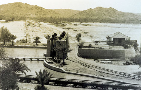 View of Laguna Dam showing the desilting basin, sluice gates, and Yuma Canal regulating gates. (National Archives, Yuma Projects Office, No date)Construction of Laguna Dam began in July 1905 and was completed in March 1909. That same year, construction of the California Main Canal, the system's largest, began. It began at the western end of the dam and headed south on the California side to point opposite the town of Yuma. Here it crossed under the river in a siphon to the town of Yuma, where it split into the East and West Main Canals to provide water to farmers in the fertile Yuma Valley. Other canals were constructed off the eastern end of Laguna Dam to farm lands along the Gila River. These irrigation systems allowed Yuma to develop into a major agricultural center.