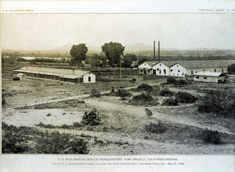 U.S. Reclamation Service headquarters, Yuma Project, located at the former Fort Yuma U.S. Army Quartermaster Depot and Yuma Crossing. (Yuma Projects Office Fifth Annual Report, May 26, 1906)By 1870, Yuma was Arizona Territory's second largest settlement, an important trade center and crossing point on the Colorado River. The area was home to the Quechan Indians who, for centuries, had been farming along the river using simple irrigation practices. Yuma became a favored point to ford the Colorado River, and with the discovery of gold in California in 1848, it served as an important military post and supply center. Yuma continued to grow during the latter half of the nineteenth century, but irrigation farming was limited until the late 1890s because of lawsuits over a Spanish Land Grant known as the "Algodones" grant (http://www.amerisurv.com/content/view/5942/136/) that tied up land on the east side of the river. In 1898 with the settlement of the lawsuit, homesteading and farming grew rapidly as did development of private irrigation companies.