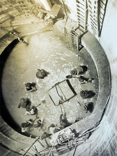 Colorado River Siphon. Looking down 55 feet into the Arizona shaft during the night shift, 1910. (National Archives, Yuma Projects Office)Adapted from The Historic Yuma Project, History, Resources Overview, and Assessment by Christine Pfaff, Rolla L. Queen, and David Clark. Bureau of Reclamation, Cultural Resources Program. Denver, 1992, Revised 1999.