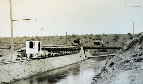 An electric engine is hauling cars filled with clay for use in the construction of Roosevelt Dam. The tracks are adjacent to the power canal that was built to divert water from the Salt River and carry it to a penstock near the dam site where it fell 220 feet to power a water turbine. The penstock and turbine were temporarily located in small cave south of and below the dam site. Electricity generated by the turbine provided power for this engine and a host of other tools and appliances at the dam site and the nearby town of Roosevelt, 1905. (Restoration photograph)