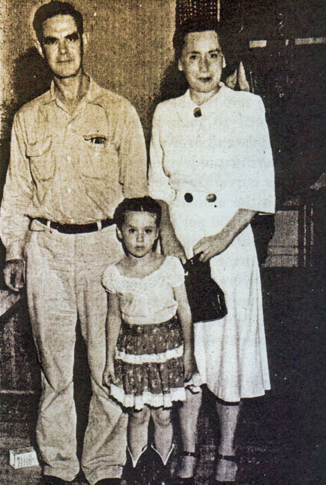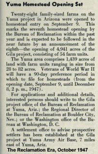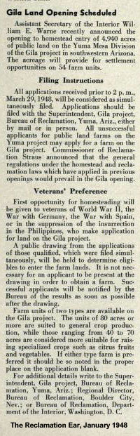 Yuma veteran Francis Henry Martin, his daughter, and Mrs. Martin were on hand to hear his name called on the 15th draw for a homestead. Photo by Samuel B. Watkins, Region III. From "The Reclamation Era", September 1948.