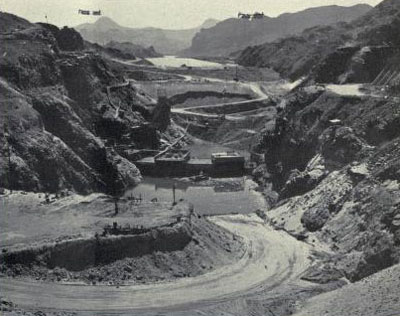 Parker Dam under construction. Average elevation of concrete, 278 feet. Looking downstream. "The Reclamation Era", December 1937.