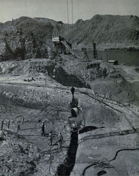 Progress at Davis Dam.Here is the first bucket of concrete being poured into the gravity wall foundation cut-off trench at Davis Dam in Ariz.-Nev. The main purpose of Davis Dam is to generate electrical energy and to reregulate the Colorado River, below Hoover Dam, through the provision of storage for irrigation and domestic use within the United States and for the delivery of water at the U.S.-Mexico international boundary. Reclamation Photo.