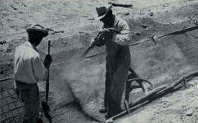 Canal Linings. Placing 2-inch header board on each side of canal. Thickening each edge of lining to 2 inches gives strength to weak points. Photo by Harry W. Myers, Region III. Reclamation Photo.