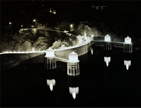 Hoover Dam with lighted intake towers, December 1940. Reclamation photo.