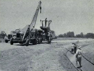 Canal Linings. Equipment, including water truck used for wetting ditch ahead of shotcrete placement. Photo by Harry W. Myers, Region III. Reclamation Photo.