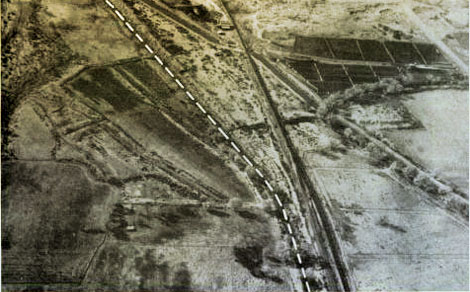 The white dotted line in this aerial photo shows remains of Hohokam hand-constructed diversion ditch for early irrigation. The square-shaped mound below modern irrigation system (upper right) marks Pueblo Grande ruins which hold many secrets of an ancient civilization.
