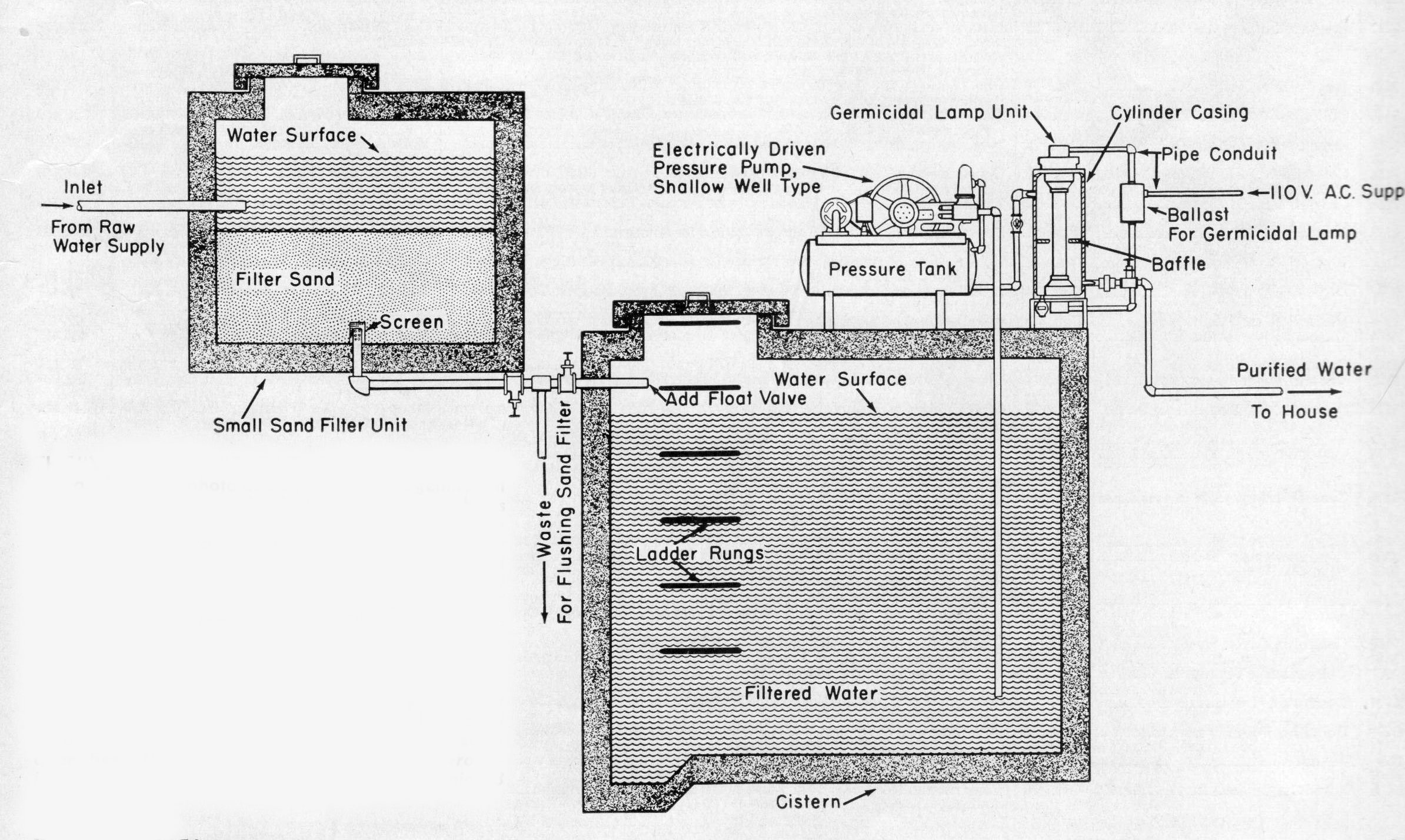 The "Violet Ray" treatment devised at Yuma Mesa. The diagram shows the pipe entering about three-quarters of the way up the cylinder casing. In Didier's purifier, water rises around lamp, is circulated by several baffles and leaves through outlet pipe seen near top on front of unit. In diagram, outlet pipe is shown near bottom of right-hand side of lamp unit. The illustration on this page is based upon shop drawings for the construction of purifying unit made at the district manager's office of the Lower Colorado River District, Yuma, Ariz. District Manager M. J. Miller states they have not yet attempted to make refinements in design that would be desirable if such units were to be manufactured in quantities. Illustration prepared by Bureau's Graphics Section in Washington, D.C., based on Region 3 drawing.