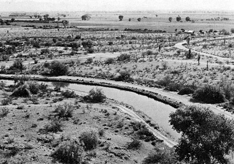 The Salt River Project's Cross Cut Canal in southwestern Scottsdale, Arizona in 1947. The landscape is primarily open desert, undeveloped, with irrigated farmland visible in the distance. Reclamation ERA photo.