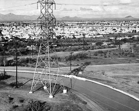 The same view of the Cross Cut Canal in 1968, showing the obvious and major encroachment of development. The increasing population portends the switch in primary water uses from agriculture to municipal and industrial use which was to come by the end of the 20th century. Reclamation ERA photo.