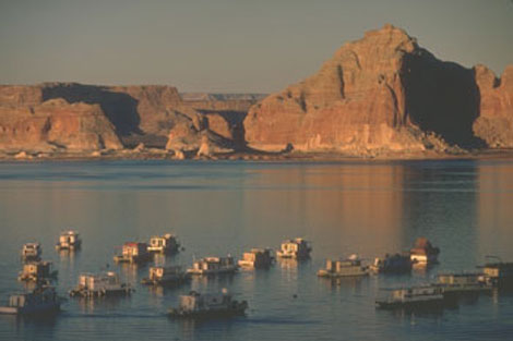Houseboats on Lake Powell, the reservoir created by Glen Canyon Dam. In the 1960s, recreation became an authorized component of Reclamation projects. Reclamation ERA photo.