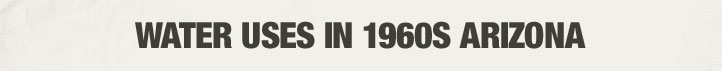 The Salt River Project's Cross Cut Canal in southwestern Scottsdale, Arizona in 1947. The landscape is primarily open desert, undeveloped, with irrigated farmland visible in the distance. Reclamation ERA photo.In the 1960s, more water was used in Arizona for agriculture than for domestic and industrial purposes. Nearly all the agricultural land in Arizona required irrigation because most of the farming occurred in the southern, more arid, half of the state. Also, cotton and alfalfa--high water consumption crops--made up a large portion of the produce.