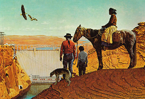 Despite his napkin sketching, Rockwell relies mainly on photography for guidance in his work, with Mrs. Rockwell serving as his official photographer. The Indian group and the horse were posed and photographed on the shady side of a barn, while countless photos of the dam and Lake Powell were taken from the canyon rim, from an airplane, and from a boat.