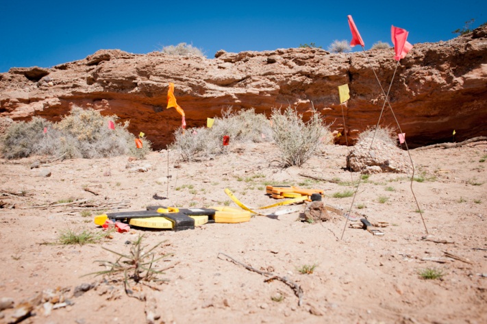 Archaeologists are conducting investigations at the Bee Hive Rock Shelter, located in the Las Vegas Wash, near Las Vegas, Nevada.