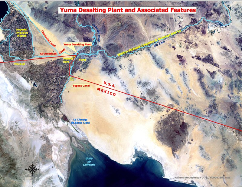 The waters of the Colorado River are shared by 7 Western States and the Republic of Mexico. Legislation in the last century divided the Colorado's waters among the states, and the Mexican Water Treaty of 1944 signed between the two countries ensures the United States will annually deliver 1.5 million acre-feet of water to Mexico. In the late 1950s, saline agricultural return flow water from the developing Wellton-Mohawk Irrigation and Drainage District (IDD) in southwest Arizona began entering the Colorado River via the Gila River. This water entered the Colorado River between Imperial Dam-the point of diversion for United States users-and Morelos Dam-the primary point of diversion for users in Mexico. This saline drainage water, combined with reduced excess Colorado River flows, lowered the quality of water being delivered to Mexico. In 1961, Mexico claimed agricultural damages and lodged a formal protest with the United States. To address this issue and establish a permanent level of salinity for Colorado River water delivered to Mexico, Minute No. 242 of the Treaty of 1944 was agreed upon by the United States and Mexico in 1973. This Minute specifies that water delivered to Mexico be no greater than 115 parts per million, plus or minus 30 parts per million, over the average annual salinity of the Colorado River water at Imperial Dam. To ensure this water quality level could be maintained, the Colorado River Basin Salinity Control Act of June 24, 1974 authorized the construction of the Yuma Desalting Plant near Yuma, Arizona. This plant would treat (desalinate) the return flows from the Wellton-Mohawk IDD so water being delivered to Mexico would be within the agreed-upon salinity levels. Completed in 1991, the YDP was operated at one-third capacity by the Bureau of Reclamation for a 9-month period in 1992 and 1993 to determine whether it would perform as designed. The test was cut short due to Gila River flood damage to the intake canal, and the YDP has not been operated since. Instead, the U.S. has used a bypass drain to meet salinity control obligations to Mexico. This Bypass Drain (see map), also authorized by the Salinity Control Act, can be used to transport untreated return flows from the Wellton-Mohawk IDD or concentrated wastewater from the YDP desalting process to the Cienega de Santa Clara in Mexico. Bypassing Wellton-Mohawk return flows (i.e., not returning the water to the Colorado River, but discharging it to the Cienega) helps the United States meet Minute No. 242 salinity requirements without operating the YDP. However, in accordance with the Minute, water discharged to the Cienega is not counted as part of the annual treaty deliveries to Mexico. Consequently, system storage from the Colorado River has been used in place of the bypass flow. Increasing water demands and prolonged and severe drought in the Colorado River Basin have heightened concerns about this additional demand on the river system. Thus, Reclamation is engaged in a public consultation & planning process to identify, analyze and evaluate potential methods to recover or replace the bypass flow. |