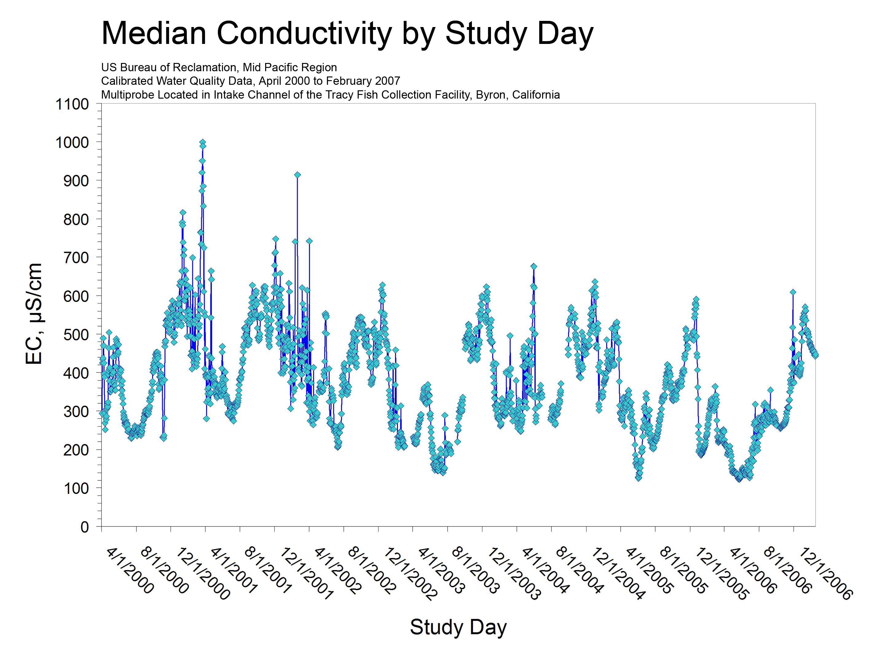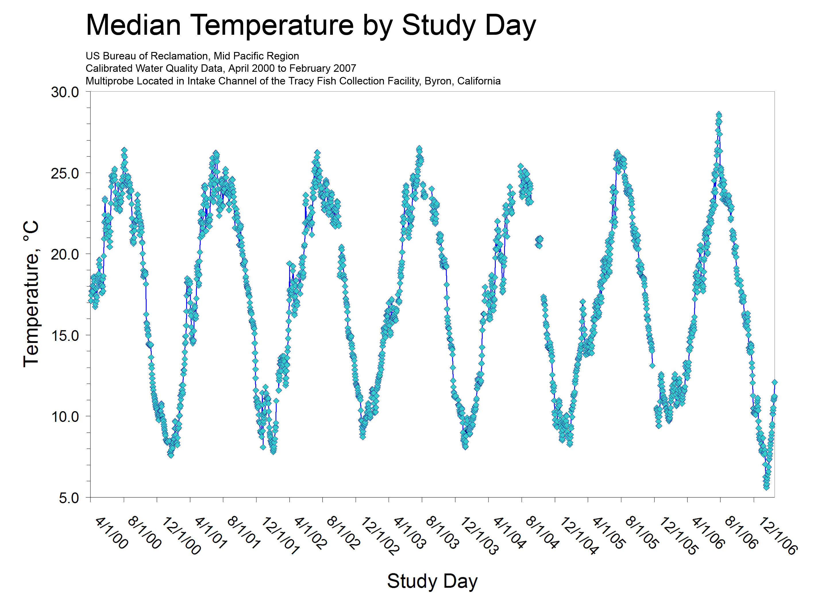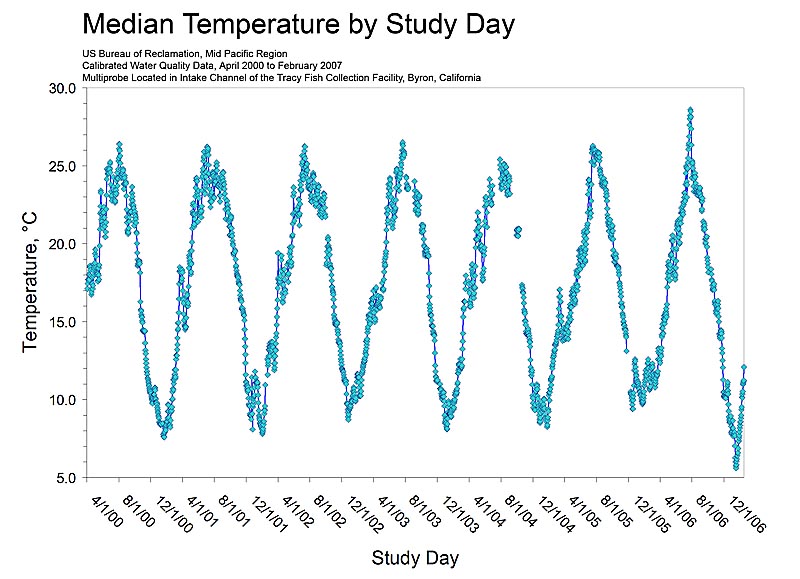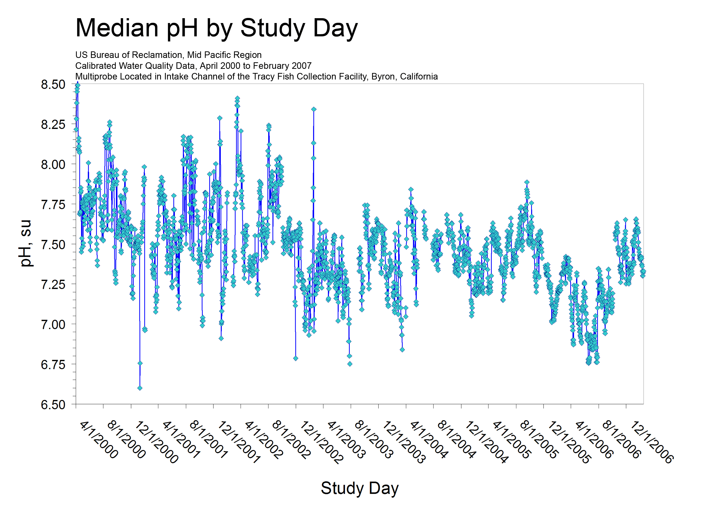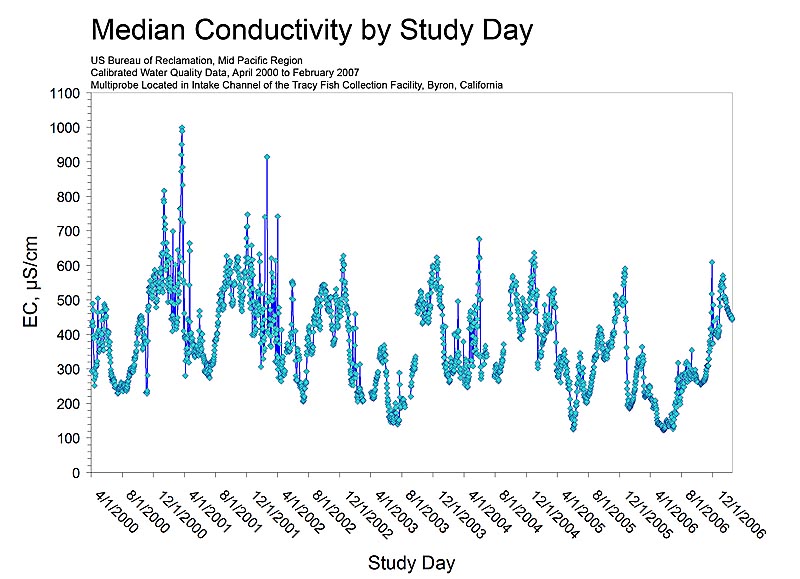 We have been operating a maintenance and calibration program for a water quality multiprobe at the TFCF since April 2000, and this program has produced seven years of high quality data. The probe (currently a YSI) is installed behind the TFCF trash rack on the north side of the intake channel, and it measures and records temperature (T), electrical conductivity (EC), pH, redox potential (Eh or ORP), dissolved oxygen (DO), and turbidity every 30 minutes. The probe is cleaned and calibrated every 2 weeks on site and data are independently checked on a monthly schedule, and validated and published annually. Procedures for calibration and maintenance have been summarized in several Tracy Series Reports (Volume 17, Volume 22, and Volume 26).