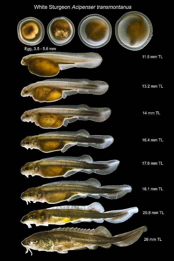 - Figure 2 - White sturgeon eggs, larvae, and prejuvenile. Eggs provided by Stoltz Sea Farm, Galt, California. Eggs and larvae incubated at 16 °C and raised at the TFCF at 18 - 19 °C. TL = total length. Photographs are not to scale.