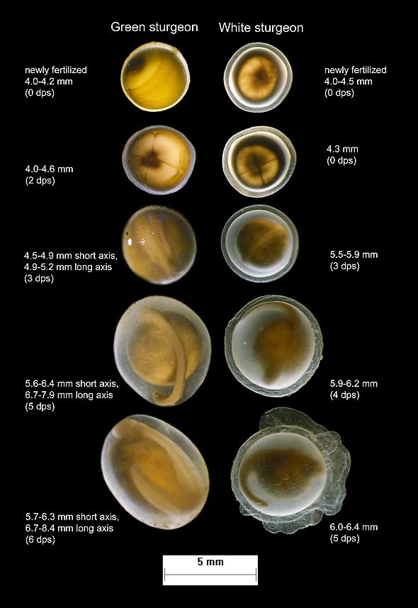 - Figure 3 - Comparing the eggs of green (left) and white (right) sturgeons. Green sturgeon eggs were provided by Joel Van Eenennaam, UCD, and incubated at 15.5 °C. White sturgeon eggs were provided by Stoltz Sea Farm, Galt, California, and incubated at 16 °C. Eggs developed and were photographed at the TFCF at 18 - 19 °C. dps = days post spawn.