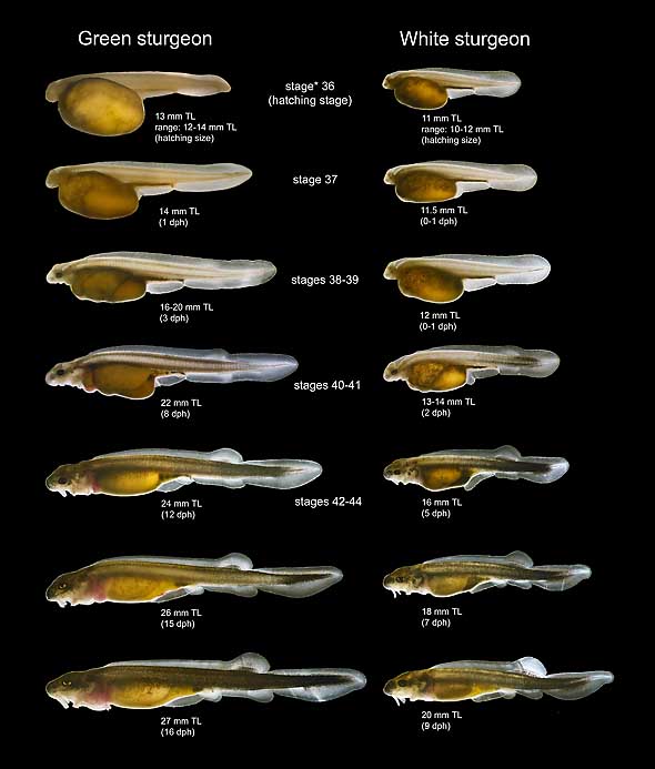 - Figure 5 - Images comparing same life stages of green and white sturgeon larvae. Life stages are based on Dettlaff, et al., (1993).