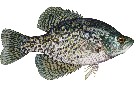 Crappie - Crappie are slightly larger than a bluegill, approximately 1.5 lbs (0.7 kg) and are popular because of their flakey white meat. Crappies run in schools, making them fun and easy to catch in large numbers. Crappie are best caught near vegetation overhangs or near fallen trees, and they're a favorite with kids and shoreline fisherman.