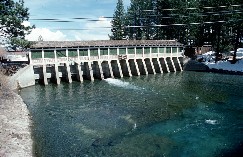 Facility: Lake Tahoe Dam - Lake Tahoe Dam was built in 1913 but was not acquired by the Bureau of Reclamation for the Newlands Project until 1915. The concrete dam has 17 vertical gates and is used to regulate the outflow into the Truckee River. It is 18 feet high and 109 feet long. The storage capacity is 744,600 acre-feet.