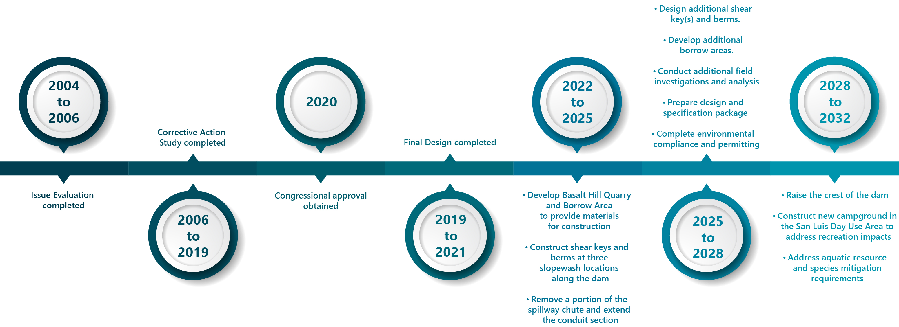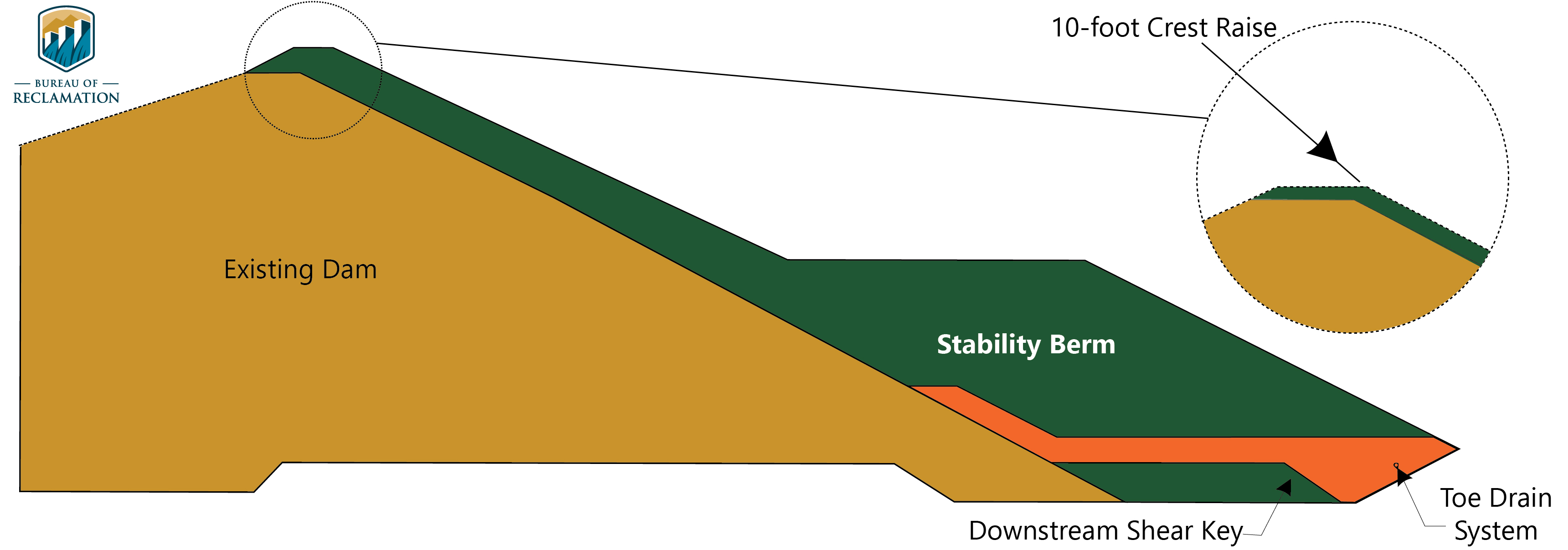 The dam safety project has added stability berms and other dam safety features to the existing 3.5-mile-long earthen dam. Increasing the dam crest by 10-feet will reduce downstream public safety concerns by reducing the likelihood of overtopping if slumping were to occur during a large earthquake.