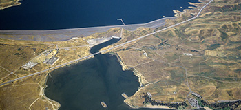 B.F. Sisk Dam and San Luis Reservoir, located on the west side of California’s Central Valley near Los Banos, are an integral part of the federal Central Valley Project (CVP) and State Water Project (SWP). The dam, built between 1963 and 1967, is a 382-foot-high earthfill embankment over 3.5-miles long that impounds San Luis Reservoir, the largest offstream reservoir in the nation. The reservoir has a total capacity of more than 2 million acre-feet, which provides water for farms, communities, and wildlife refuges south of the Sacramento-San Joaquin Delta. B.F. Sisk, previously called San Luis Dam, is owned by the Bureau of Reclamation and operated by the California Department of Water Resources.