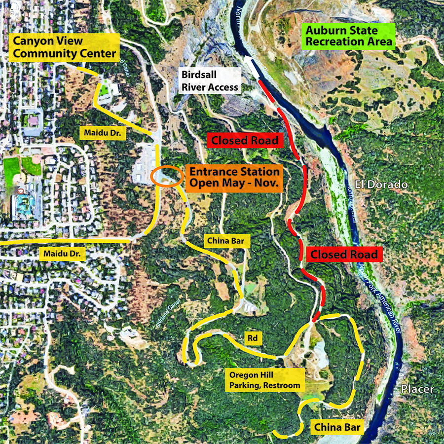 The road to the Birdsall River Access will be closed from the China Bar Road at Oregon Hill downhill to the river at Birdsall River Access. The closure is indicated in red on the map included. Other trails, and the parking and restroom at Oregon Hill, will remain open to the public. The China Bar Road from Maidu Drive in Auburn is open to vehicles on weekends and holidays from April to September, and open to hiking, biking and horse riding all year.