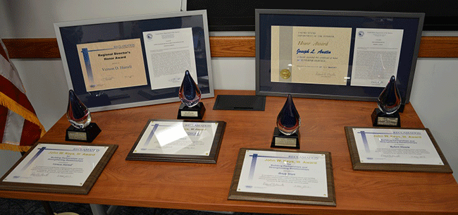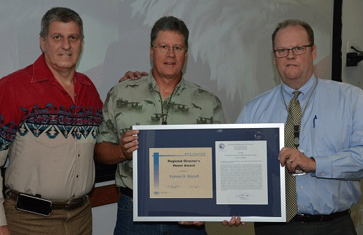 Vern Harrell accepting the John Keys award from Regional Director Brent Rhees and Area Office Manager Ed Warner