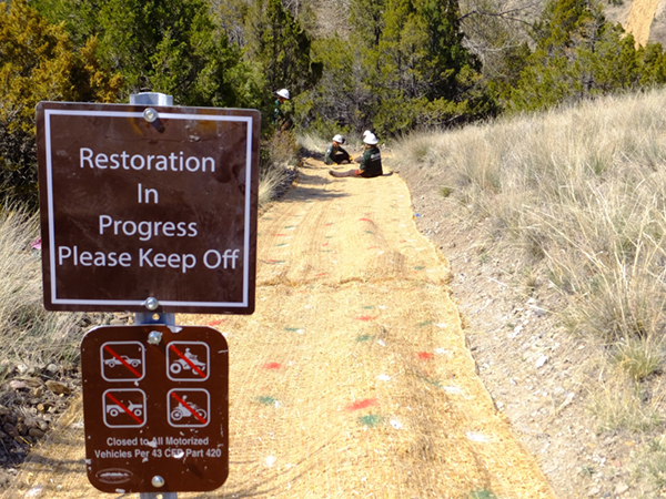 Steep hillsides marred by OHV use cannot regenerate on their own due to increased erosion after rainfall.