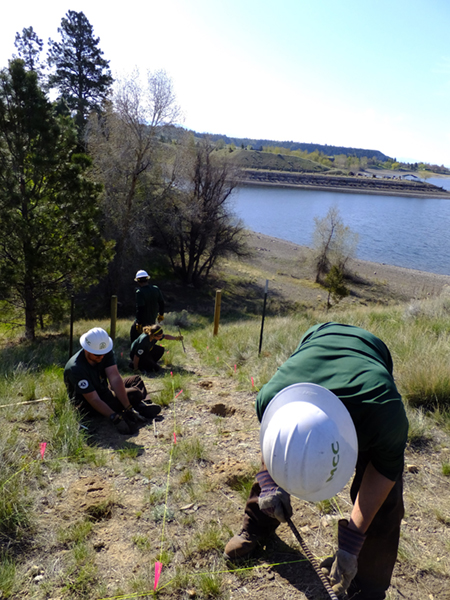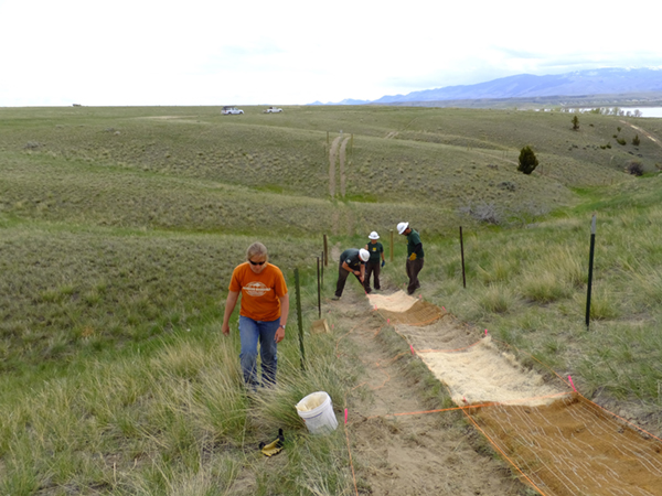 The Canyon Ferry Field Office collaborated with professors from Montana State University to set up field test plots to determine an appropriate native seed mix and to determine if erosion control fabric would assist in native plant growth on steep hillsides. An agreement was created in 2014 with the Montana Conservation Corps (MCC) to provide the labor needed to begin restoration efforts. MCC has helped Reclamation staff to restore several miles of unauthorized OHV trails on the east side of the reservoir over the past three years. These projects are continuously monitored to ensure OHV use does not reoccur in these same areas in order for the restoration process to be successful.