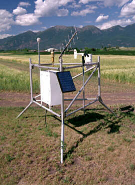 Real-time AgriMet data is transmitted from individual stations (photo) to Reclamation's receive site in Boise, Idaho. Each station's data is collected once an hour. Data collection intervals within the hourly collection period are dependent on the specific sensor equipment at each station. Types of data collected at each station varies. The data is processed on computers at the Boise Regional Office, and then made publicly available.