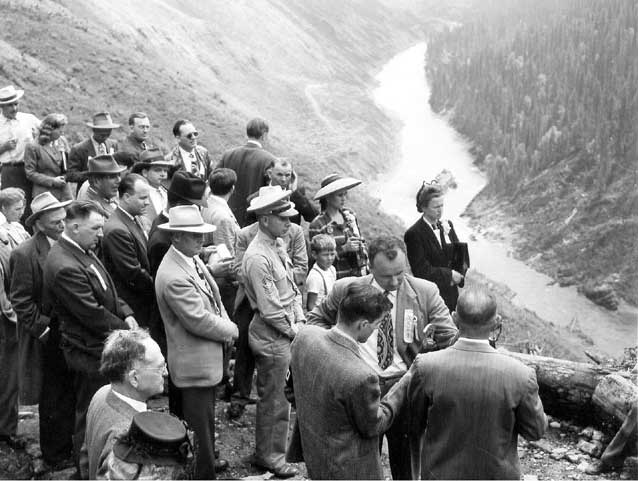 Construction Engineer Clyde H. Spencer addresses at Vista Point, before Governor Sam Ford sets off dynamite blast indicating start of construction.
