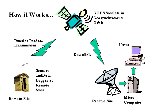 Remote site typically collects data each 15 minutes and transmits via GOES satellite once every 4 hours. Sensors and data logger at remote sites provide data on a variety of conditions. Sites can collect and transmit on one-minute or random cycles to allow for special conditions. Reclamation's central downlink facility in Boise, Idaho receives and processes the data on VMS minicomputers. Some data are collected via line-of-sight radio links, then relayed to the Boise site. Data are distributed to users via Internet, DECNET, DOINET, dial-in modem, and web communication links.